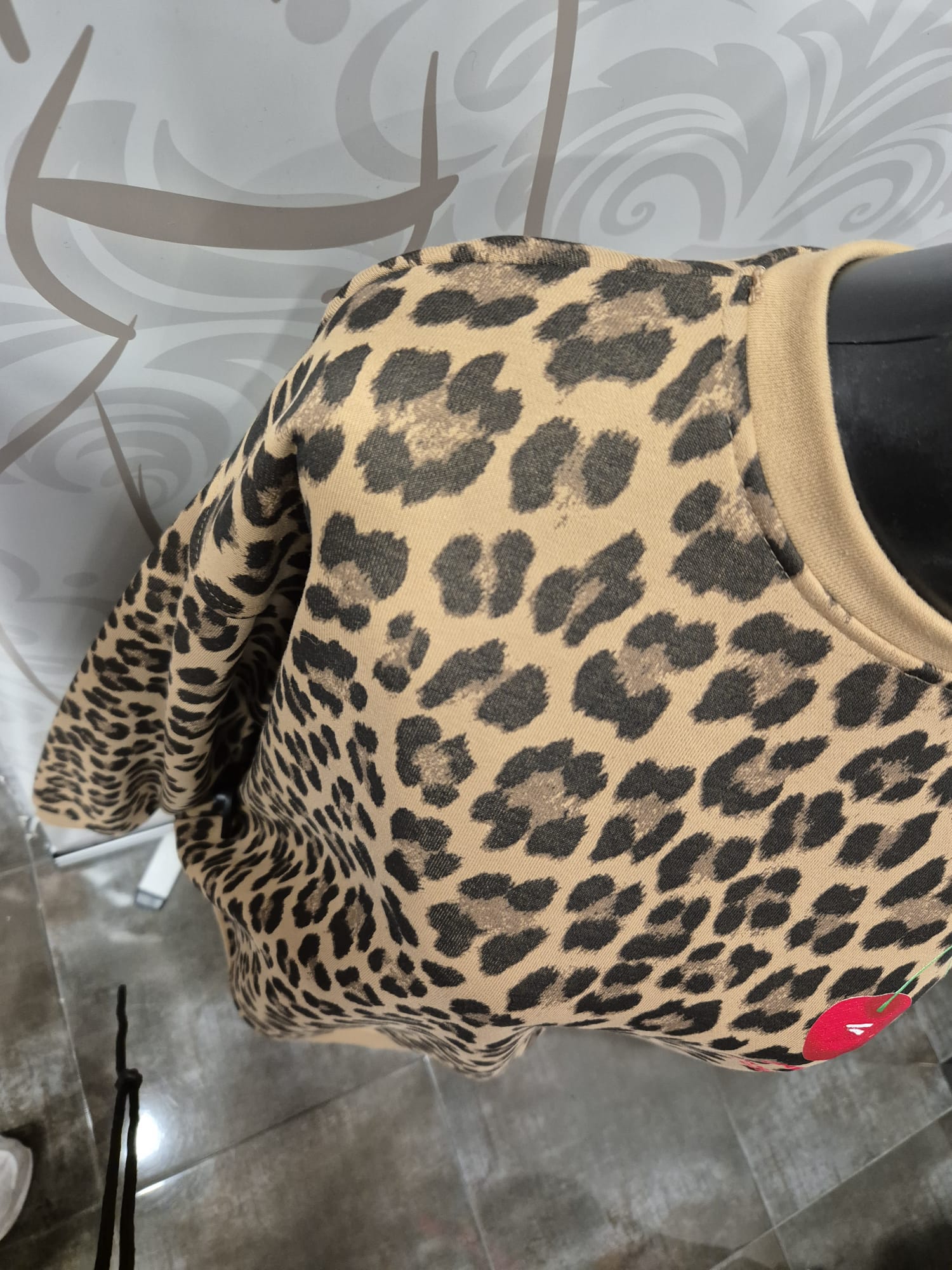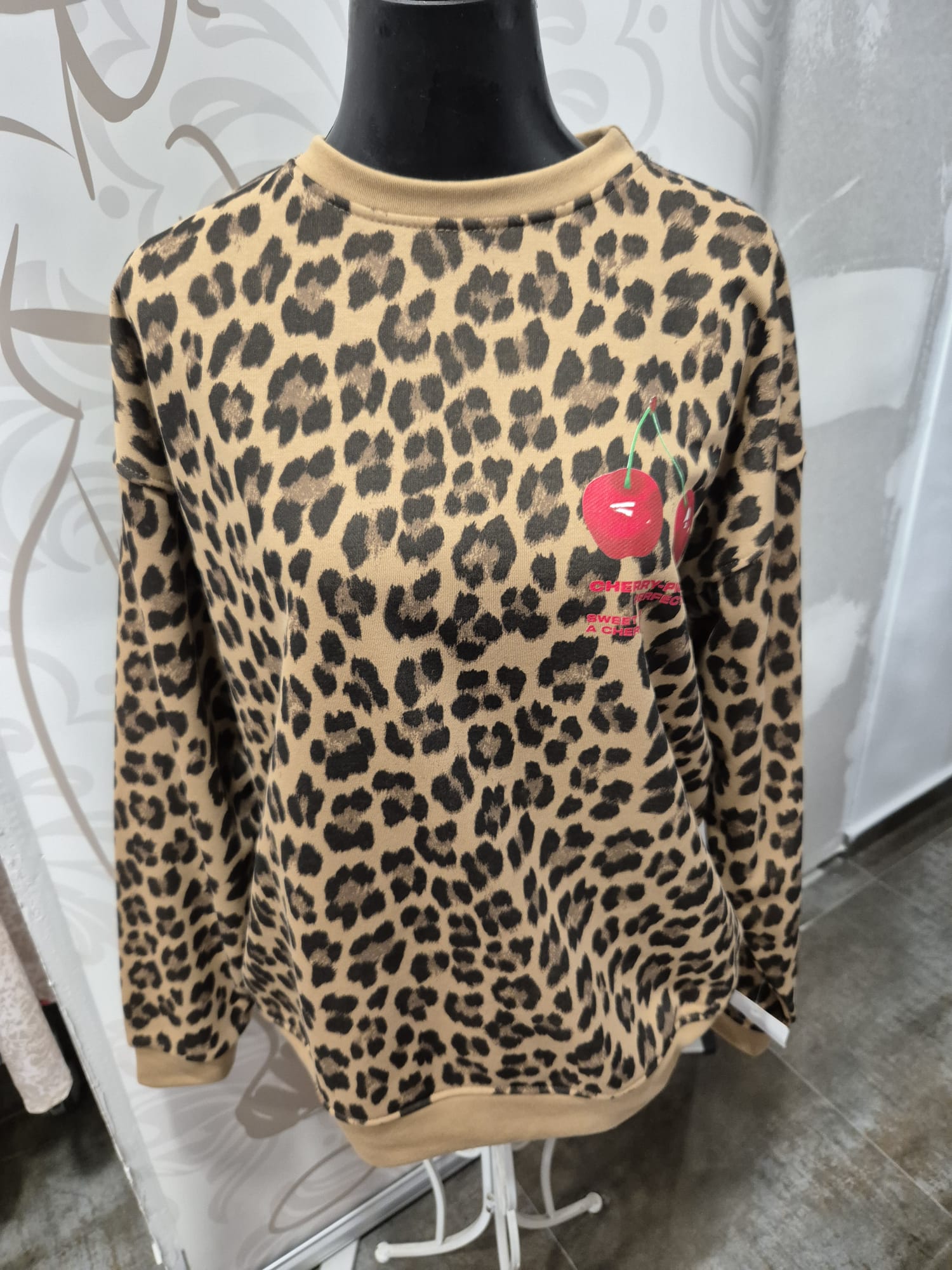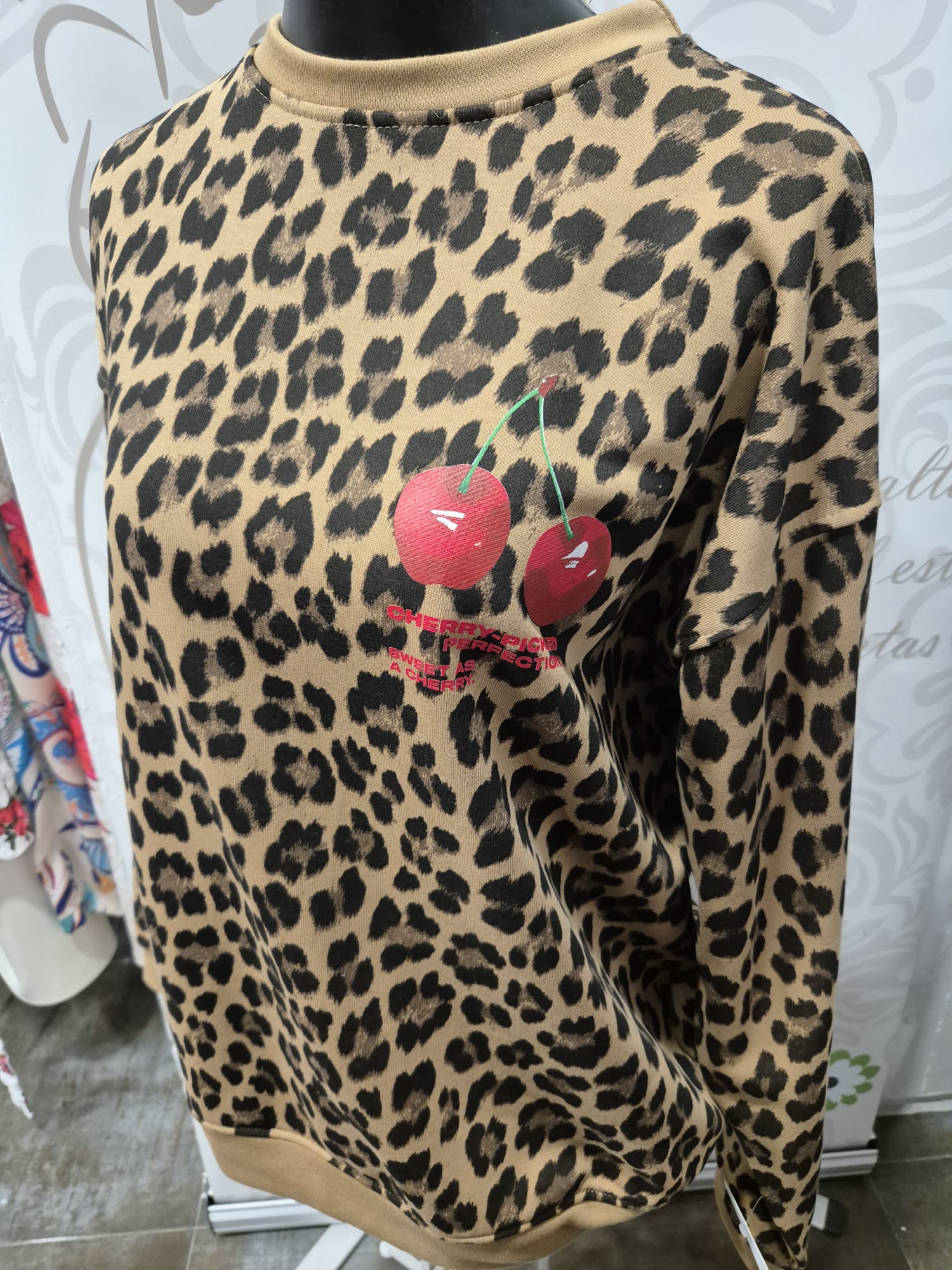 Sudadera de estilo casual con estampado animal print en tonos beige y marrón, ideal para dar un toque original y actual a tus looks diarios. Dibujo de cerezas en el pecho añade un toque femenino y original que marca la diferencia. Una prenda versátil y cómoda.