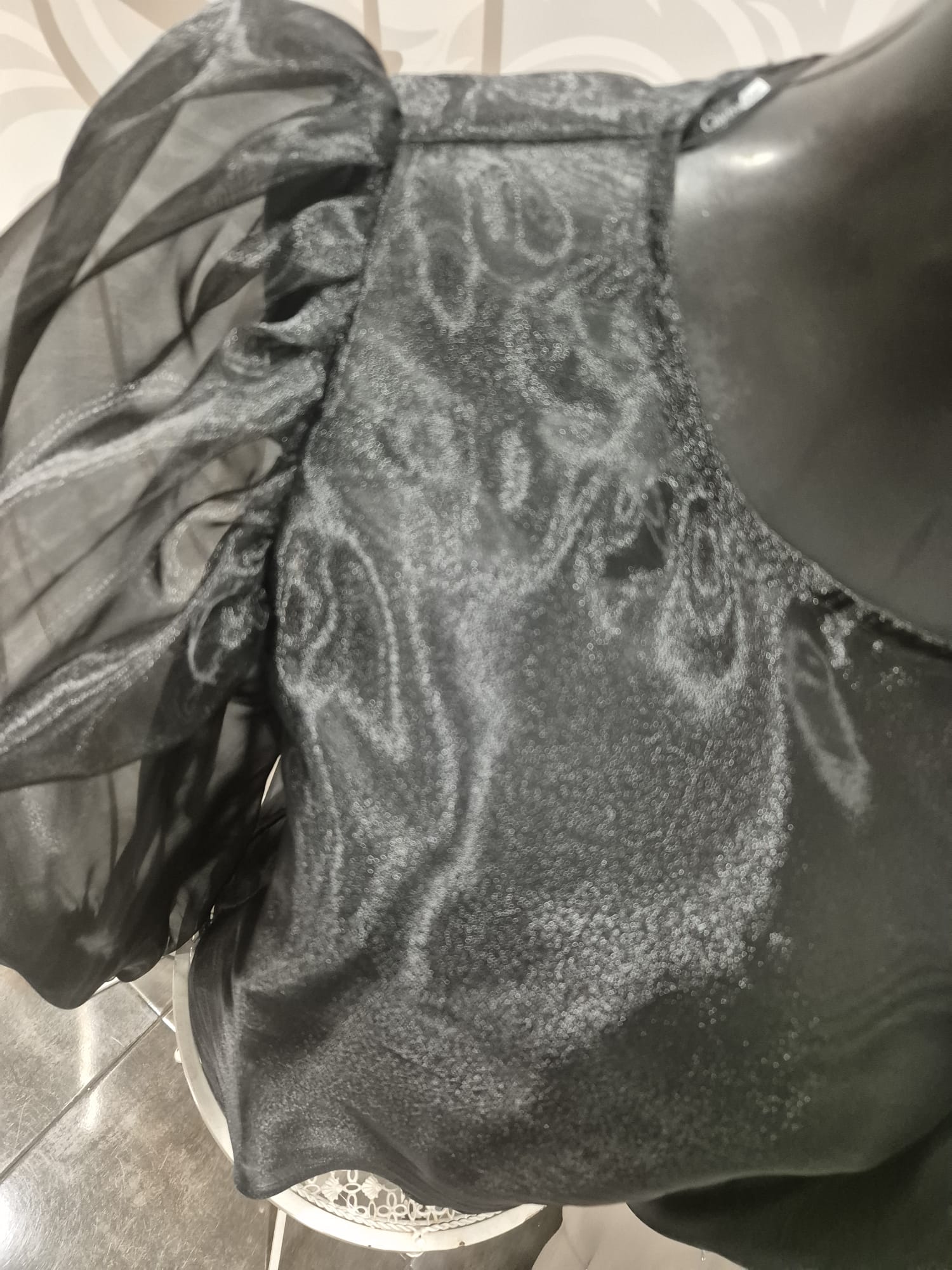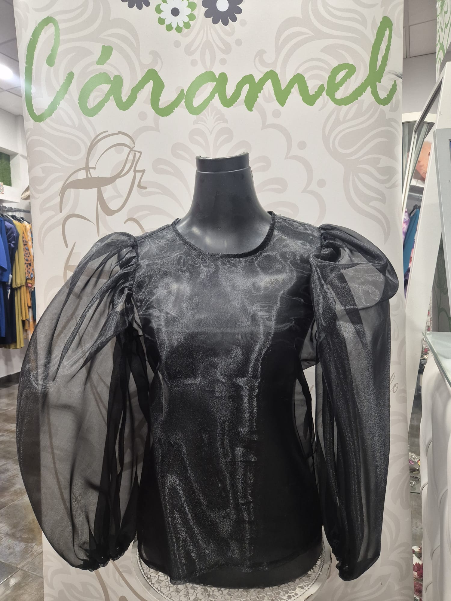 Top transparente con tejido de organza, manga abullonada.