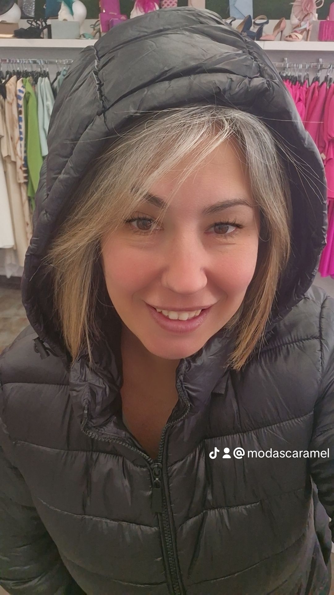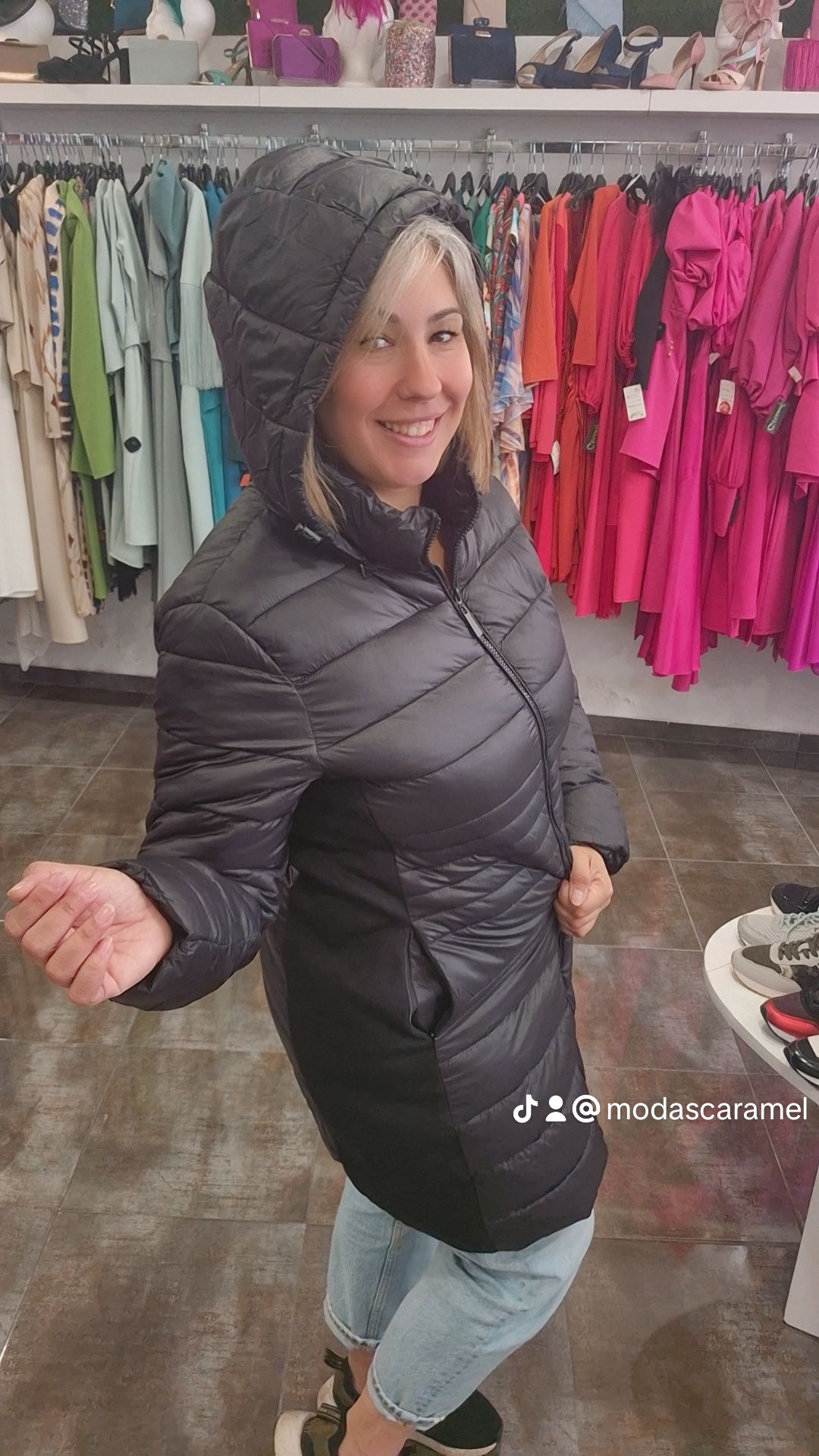 Abrigo con dos tipos de tejido y gorro desmontable.