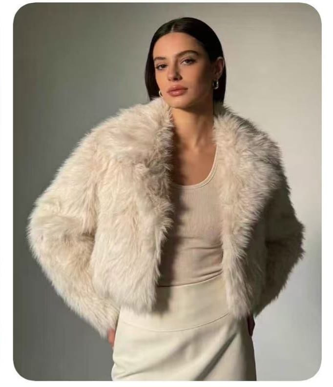 Abrigo de pelo beig, forrado en su interior, perfecto para cualquier ocasión.