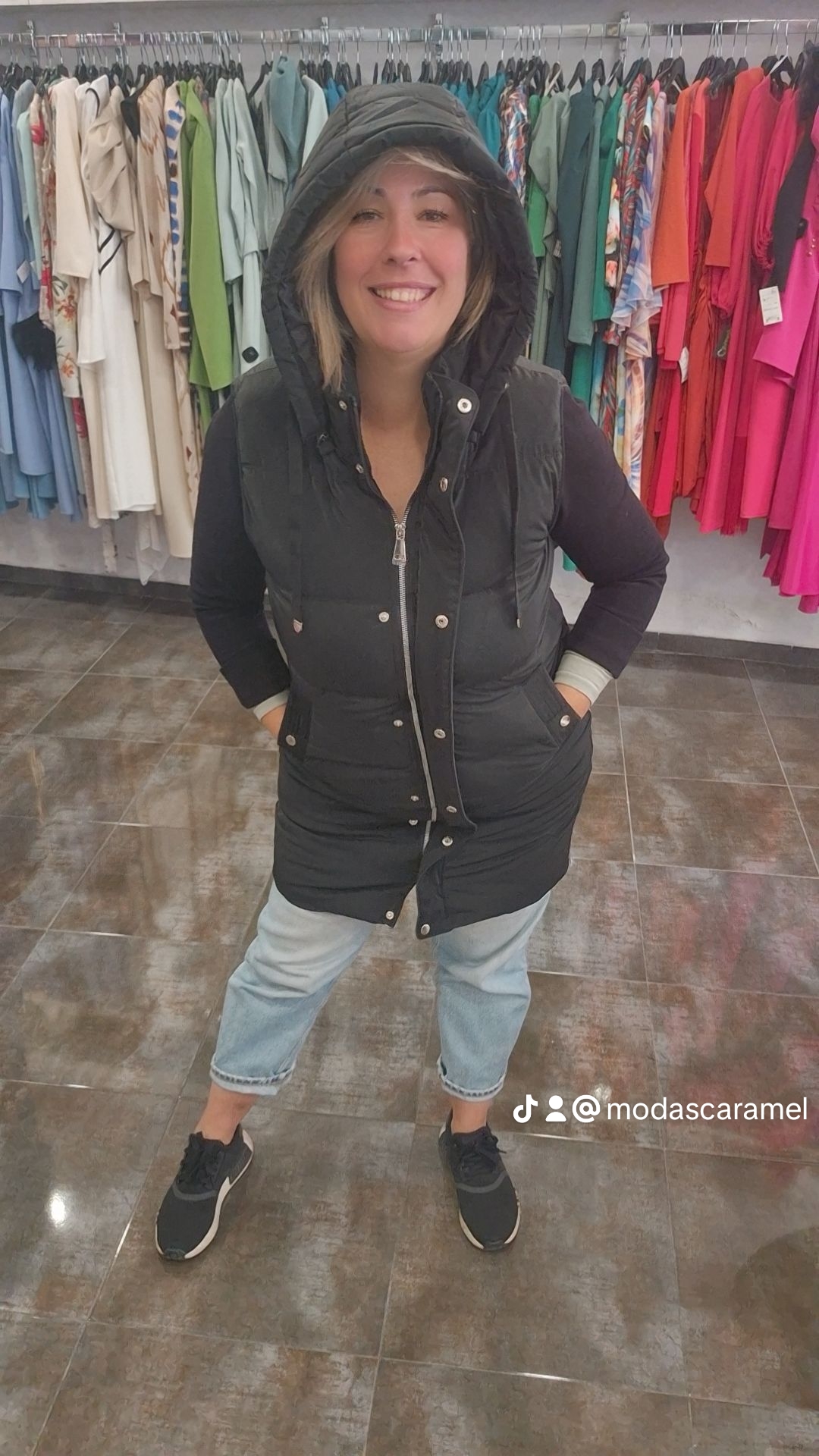 Abrigo sin manga nacional con cremalleras laterales y central, el gorro es desmontable.
