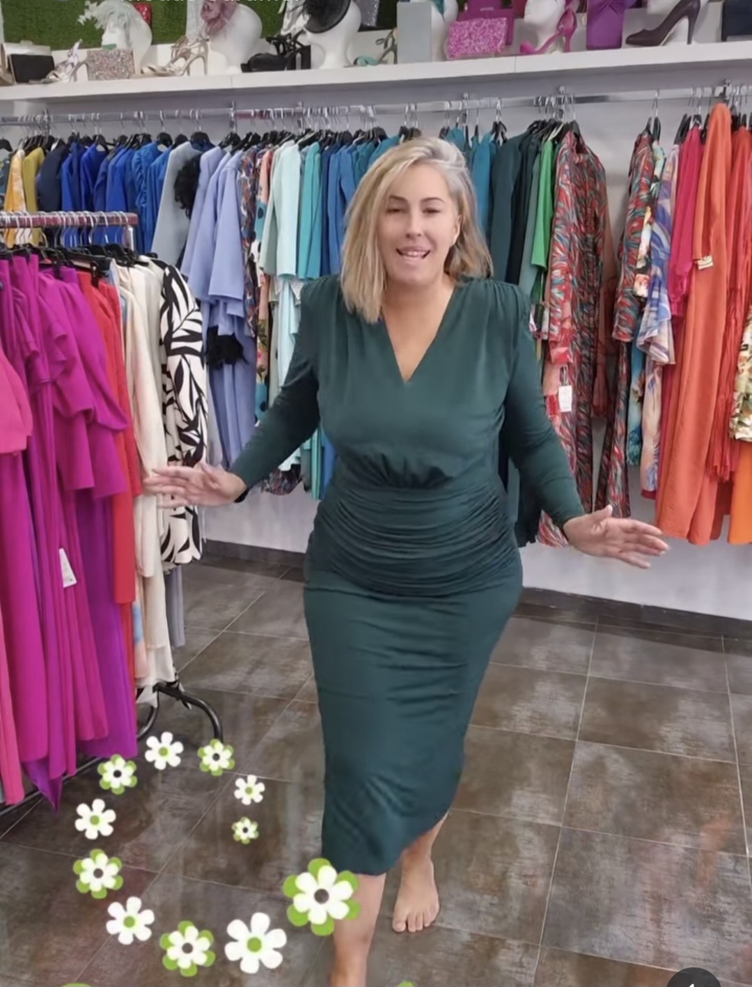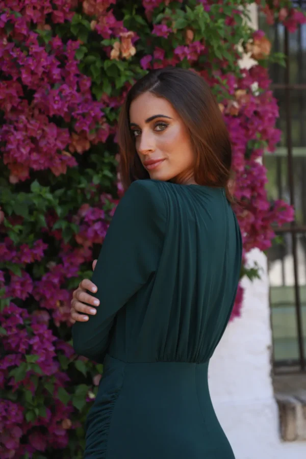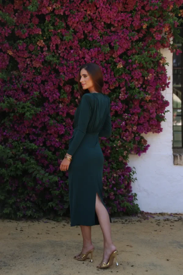 Un vestido midi con escote en pico y mangas largas que combina sensualidad y elegancia contemporánea. Confeccionado en tejido de punto, ofrece comodidad y un ajuste perfecto. Ideal para cenas elegantes, eventos nocturnos y cócteles sofisticados.