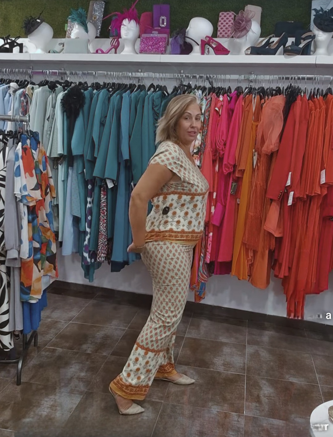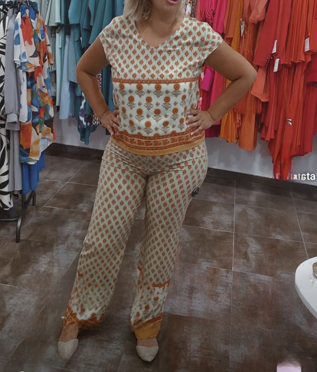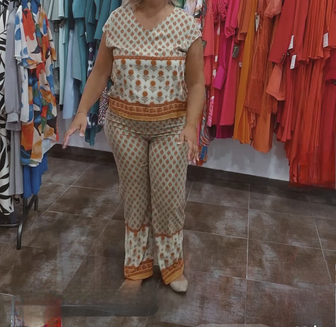 Conjunto de dos piezas, el tejido no estira, en su etiquetado pone talla 46 pero para nuestro punto de vista es algo mas pequeño, las medidas son 114 cm de pecho, cintura 102 cm, caderas 128 cm.